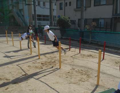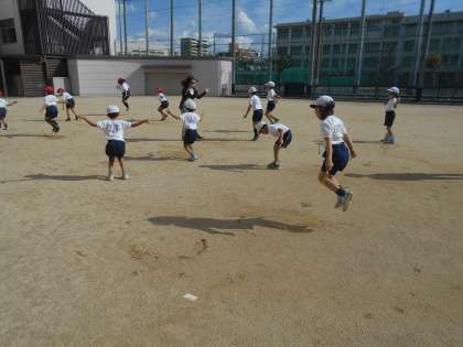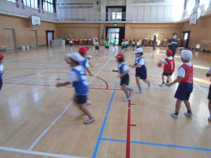 1組は運動場で縄跳びと鉄棒、2組は講堂でドッジボールに分かれてしています。今日で学習が終わりになるので、来週からは交代して活動します。