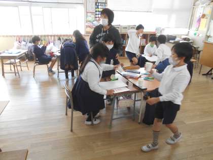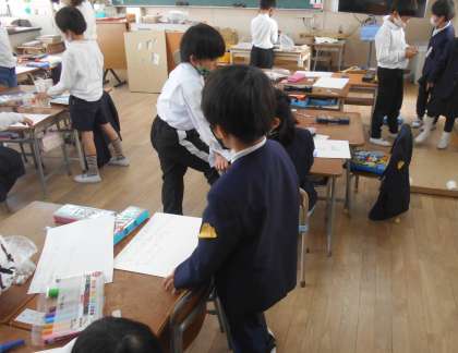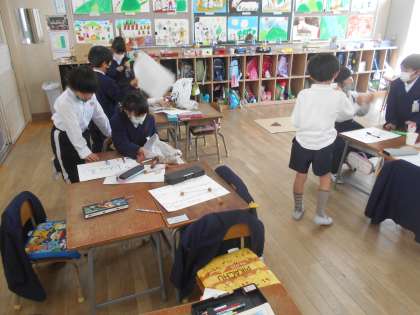 あきまつりをしました。どんぐりやまつぼっくりを使った遊びを考えて、お店を作りました。グループに分かれていろいろなお店の準備をしました。お店作りの様子です。(1−1の様子です)