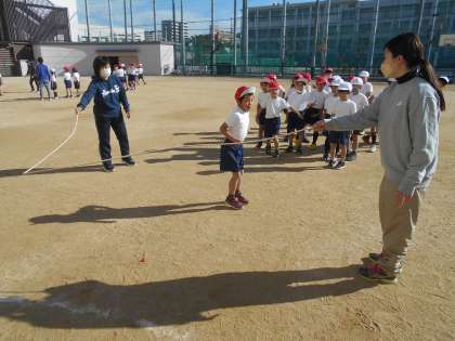 かけ足をしています。火・木曜日に運動場でかけ足をしていますが、体育の時間もしています。少しでも体力をつけてほしいです。その後は長縄をしました。大波小波で縄をよく見て跳ぶことをしています。慣れてくるとみんなリズムよく跳ぶことができるようになりました。