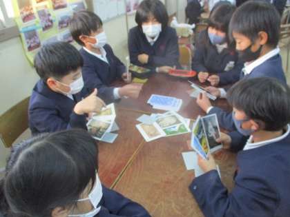 今回はアートカードを使ってゲームを行いました。一人4枚ずつ配り、手元のカードを減らしていくゲームです。減らし方は山札のカードと自分のカードの似ているところを探して発表します。「色」「形」「イメージ」というテーマで似ているところを探しました。アート作品の細かいところまで鑑賞し、思ったことを言葉にして伝えます。5分間で全部のカードを減らすことができる子もいました。見て感じたことを自然と交流できていたと思います。