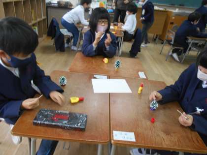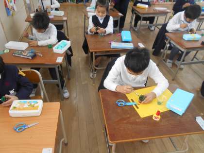 まつぼっくりを使ってツリーを作りました。ペットボトルのキャップにまつぼっくりを置いて、色をつけました。最後に飾りをボンドでくっつけて完成しました。形や色の違うツリーができて子どもたちも喜んで見ていました。(1−1の様子です)