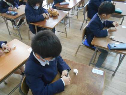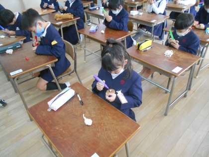 こまに色塗りをしました。回るところに自分で好きな色や模様を描きました。カラフルなこまに仕上がりました。回すのが楽しみですね。1−2の様子です。