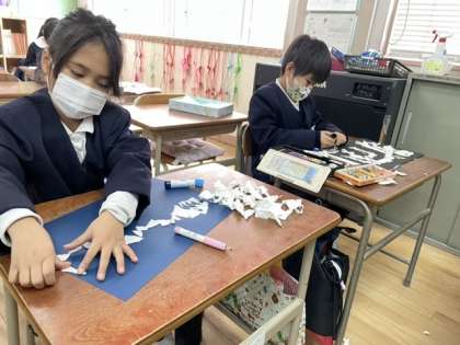 2、黒か紺の画用紙(どちらか好きな方を選びます)に1の紙を貼っていき、