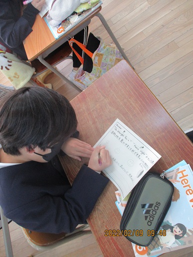 道案内の単元を学習しています。まっすぐ2ブロック進む、右に曲がる、左を見る、など多くの情報を順番に聞き取らないといけないので、英語の読みとり、聞き取り、など横断的な力が求められます。今回はタブレットと黒板で実際の道案内を実際に英語で行いました。