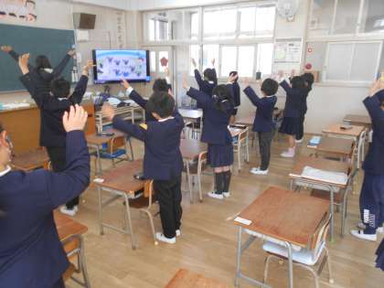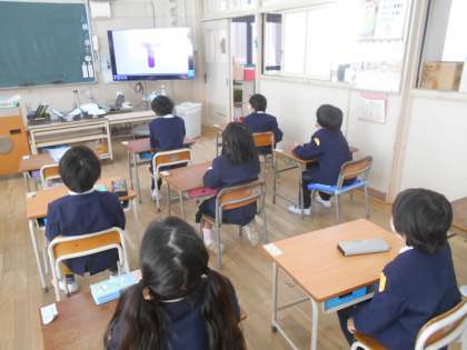 1時間目が始まるまでの時間に英語の学習をしています。テレビを使って歌を歌ったり、体を使って動作をしたりして活動するので、1年生は英語の時間を楽しみにしています。(1組の様子です)