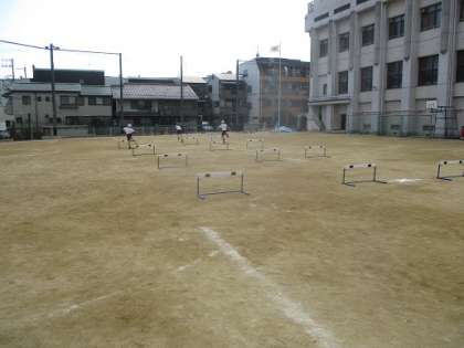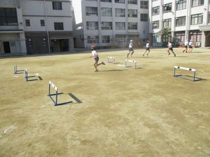 体育の時間の後半はハードル走です。勢いよく走ること、高く飛ばないために遠めから踏み切ることを意識して練習しました。「0・1・2・3」のリズムは自然とできるようになった子が多かったです。