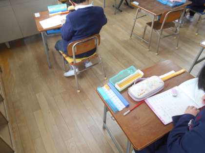 図をかいて考える学習をしています。まずブロックをおいて、次にノートに図をかいて、たし算なのか引き算なのかを自分で考えて式にして答えを出しています。文章の問題なので、みんなでよく読んでから取り組んでいます。(1組の様子です。)
