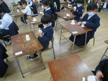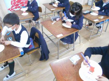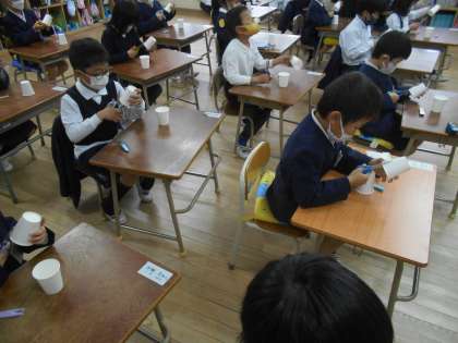 紙皿と紙コップをくっつけてかみざらころころを作りました。色ペンで色をつけたり、画用紙でかざりを作ったりしていろいろな作品に仕上げました。教室や廊下で転がしてみて楽しく活動しました。(2組の様子です)