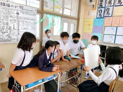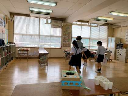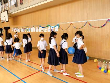 5年生のお店の様子です。1組は「サッカーボーリング」「ピンポンパン」,2組は「ふたごの画家ゲーム」「ピンポンカップイン」でした。どちらの組も,班のみんなで協力するゲームで,どこの班も協力もみんなで力を合わせて取り組むことができました。