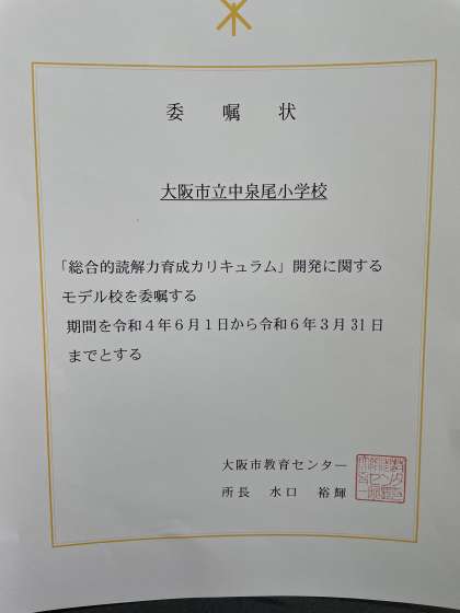 本校では、これまで国語科を中心に文章の読み取りを深める取り組みを進めてきました。本年度は、さらに読み取ったことをもとにしっかりと自分の意見を持ち、周りの人に伝える力を育成していこうと「総合的読解力育成カリキュラム」に取り組むこととしました。これは大阪市が進めていこうとしている事業で、本校を含めて5校の小学校が大阪市のモデル校として指定されています。
