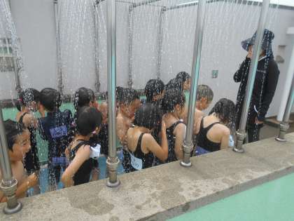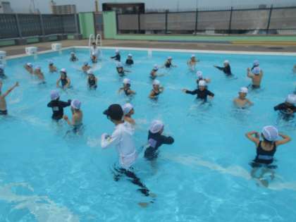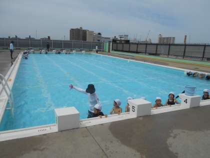 初めてプールに入りました。プール水泳での約束の話を聞きながら、1時間入りました。今日はプールを1周歩いて、そのあとは体を動かす運動をしました。