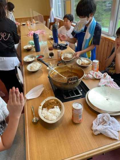 出来上がった自分達のカレーをいただきました。班ごとに微妙に違いがあり、面白かったです。三杯目と言いながら美味しそうに食べる人も。楽しい昼食となりました。