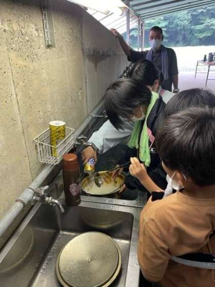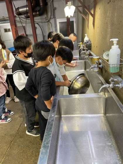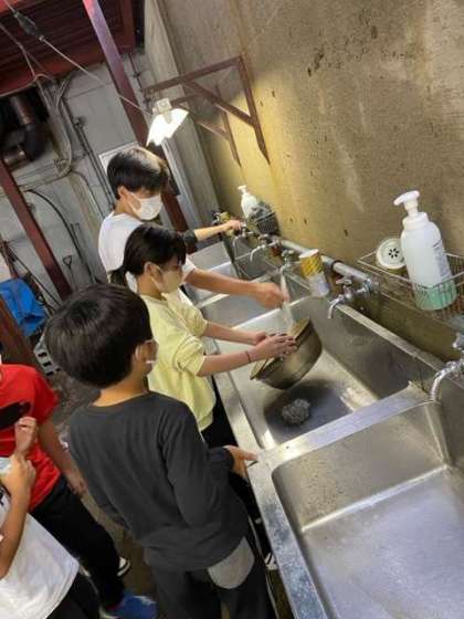 美味しくいただいた後はみんなで協力して後片付けです。お鍋にこびりついたカレーを一生懸命擦って綺麗にしました。