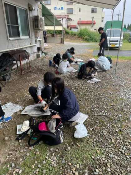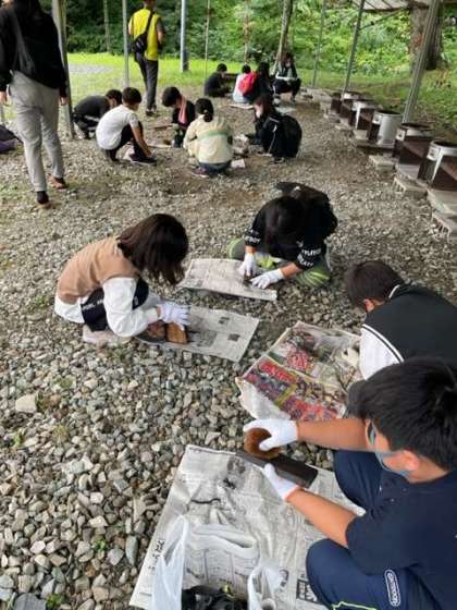 2日目の午後の活動は焼き板作りです。真っ黒に煤けた板をたわしや新聞紙を使って光沢が出るまで磨きます。もういい?いえいえまだまだですよ。