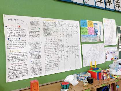 夏休みの自主学習が壁に飾られていました。都道府県を調べたり,朝顔の花弁で染物をしたことをまとめたり,みんなそれぞれ工夫を凝らしていました。素敵ですね。