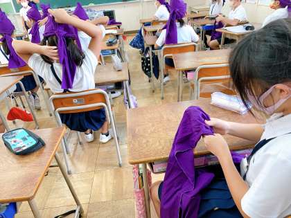 エイサーを踊るときに使うサージをまく練習を行いました。1年ぶりのサージに.子どもたちはちょっぴり苦戦していましたが,友だちと協力しながら取り組んでいました。