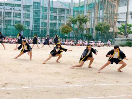 鉢巻きに法被姿,腰を低くして踊るかっこいい5年生にみんな釘付けでした。本番も楽しみですね。