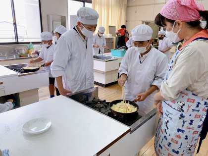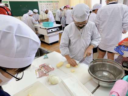 6年生の調理実習の様子です。みんんでジャーマンポテトを作っていました。普段,お家のお手伝いでお料理をしている人もいて,包丁さばきがさまになっていました。おいしそうなにおいがしていました。