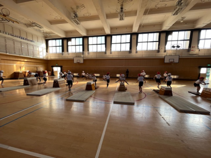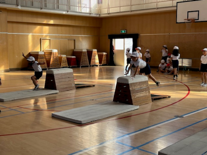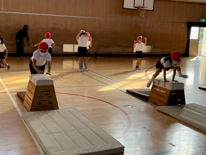 2年生の体育では、とびばこの学習をしています。どうすれば、上手にとぶことができるのか、友だちのいい所見つけをしながら、何度も練習しています。自分でとびばこの高さを選んで、挑戦することができました。