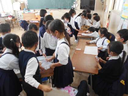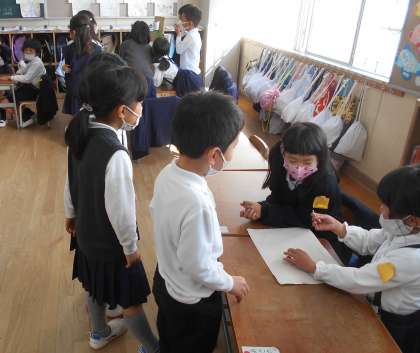ゲーム屋さんをしました。はじめは1組の人が作ったゲームを、2組の人がお客さんになってしました。その後、2国の人が作ったゲームを、1組の人がお客さんになってしました。お店番の人は、自分の役割をきちんとできました。楽しく活動できました。(1組がお店番の様子です。)