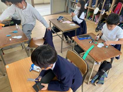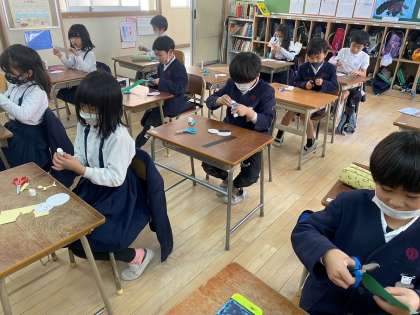12月の教室の飾りとして、雪だるまの飾りを作りました。ハサミの使い方がどんどん上手になっていて、細かい飾りも付けることができていました。子どもたちはとても楽しそうで完成した雪だるまは個性があり、すてきでした。