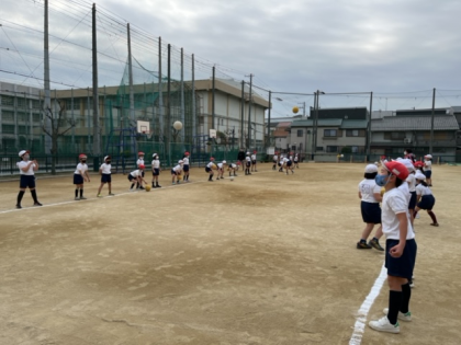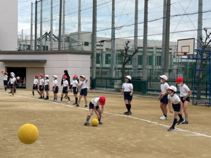 キックベースボールをするために、ボールを投げたり受けたりする練習をしました。転がってきたボールが足の間を通り抜けていかないように頑張っていました。