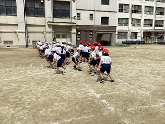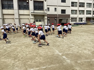 体育では、体つくり運動に取り組んでいます。今回はネコとネズミ、というゲームをしました。ネコかネズミを聞き分けて、走る、という頭を使う運動です。みんな一生懸命はしりました。