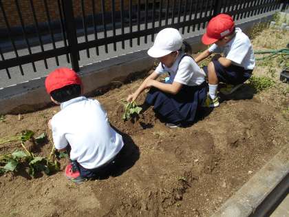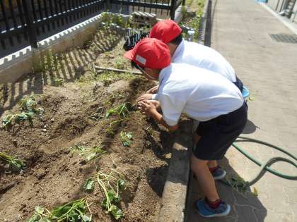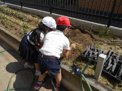 学習園にサツマイモの苗を植えました。1組のあとに2組が植えました。苗を横にして切っているところを土に埋めました。これからどんどん大きくなって、たくさんのお芋ができるように水やりをしないといけませんね。