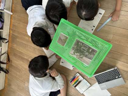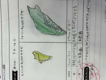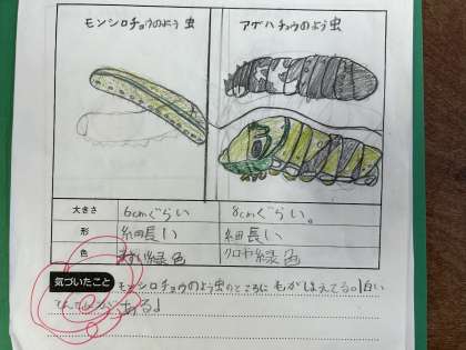 「よう虫はおとなしいのに、さわるとくさいえきたいを出す。」や「さなぎは糸みたいなものでくっついている。」など、タブレットで調べただけでは、気づかなかったこともしっかり観察することができていました。