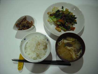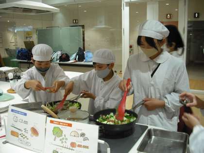 スタッフの方から私たちの生活に欠かせない資源はどこからきているか、また調理に関する沢山のお話を聞きました。エプロンに着替えて、実際に調理スタートです。班のメンバーと声を掛け合いながら協力して、「炊飯・みそ汁・ふりかけ・野菜炒め」を作ることができました。