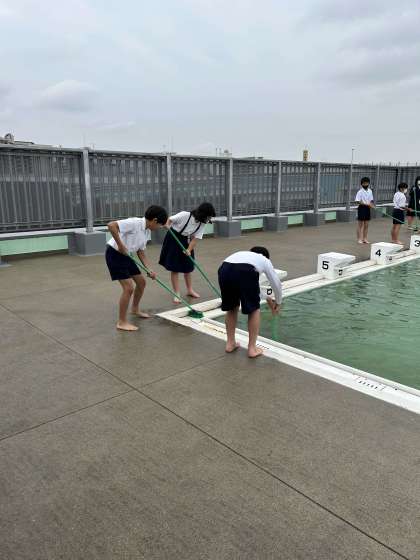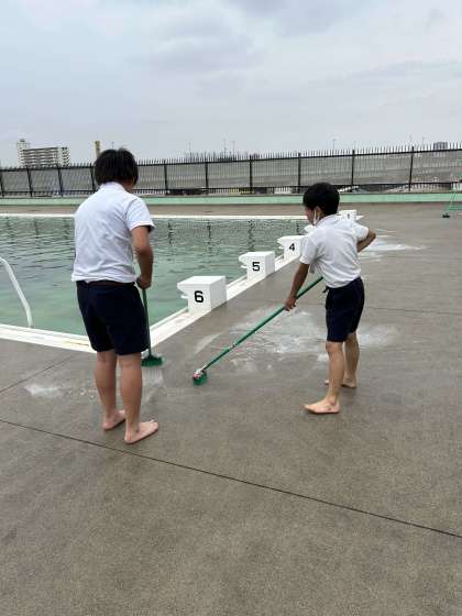 運動委員会の子どもたちは、12日のプール開きに向けてプールサイドの掃除を頑張りました。