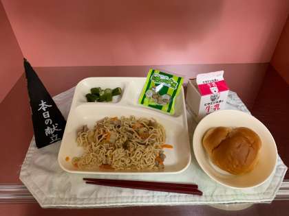1/2こくとうパン、牛乳、和風焼きそば、オクラの甘酢あえ、まっ茶大豆でした。