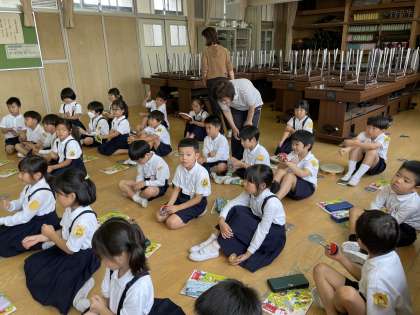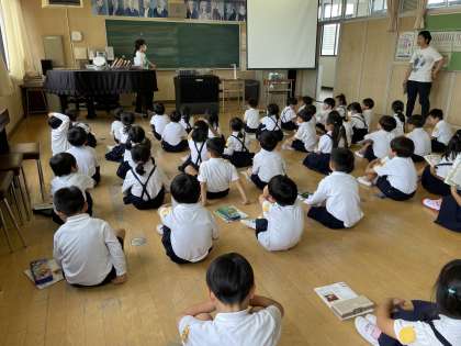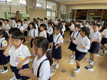 はじめて音楽室に行き、校歌の練習や楽器を使いリズムの練習をしました。