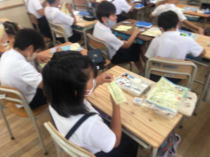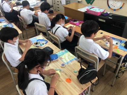 まずは手順を確認するために動画を見ました。そして、止め外しのしやすいボタンになるように、すき間を考えつつ、固く丈夫に縫う練習をしました。子どもたちは初めての作業に苦労しつつも、針先に注意して丁寧に縫えるよう頑張っていました。