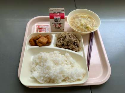 ごはん、牛乳、ゴーヤチャンプルー、五目汁、あつあげのしょうがじょうゆかけでした。