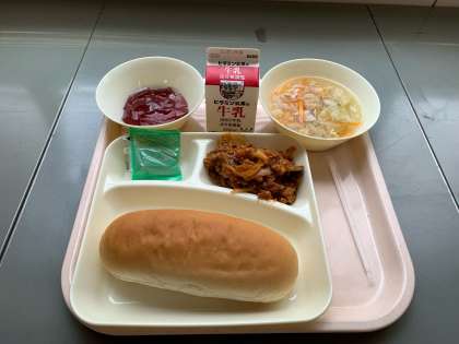 コッペパン、りんごジャム、牛乳、なすのミートグラタン、スープ、ダイスゼリー(ぶどう)でした。