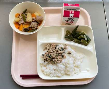 ごはん、牛乳、豚肉とじゃがいもの煮もの、オクラの梅風味、ツナっ葉いためでした。