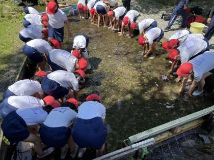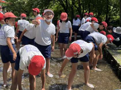 晴天の下、冷たい水の中に入り、魚つかみをしました!