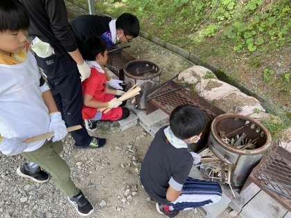 火の係は材料を切ってもらっている間に、カマドの準備です。
