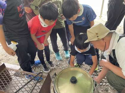 マッチを擦って火をつけます。学校でもほとんど使わなくなったマッチを使うのは難しかったようです。