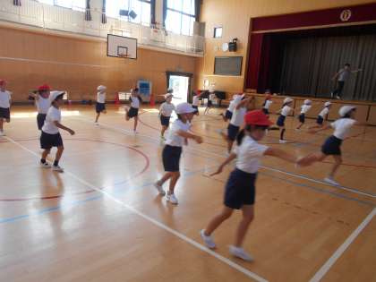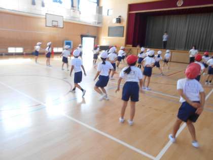 今日の体育の時間から運動会の練習を始めました。音楽を聴いてから動きをしました。初めてなので戸惑いながらでしたが、リズムをとりながら楽しそうに活動しました。