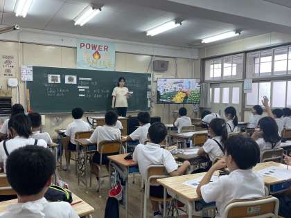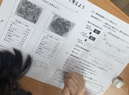 栄養教諭の先生から、食料自給率について学びました。日本の食卓に並ぶ食材は、輸入しているものが多くあり、年々食料自給率が下がっているということを知りました。食料自給率を上げるために、身近で取り組めることを考えて意見交流を行いました。