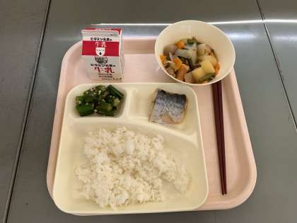 ごはん、牛乳、さごしの塩焼き、含め煮、オクラのいためものでした。