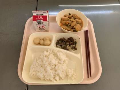 ごはん、牛乳、一口がんもとさといものみそ煮、牛肉と野菜のいためもの、みたらし団子でした。