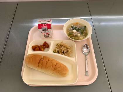 おさつパン、牛乳、ヤンニョムチキン、とうふのスープ、切干し大根のナムルでした。