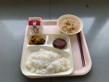 ごはん、牛乳、和風ハンバーグ、みそ汁、かぼちゃのいとこ煮でした。