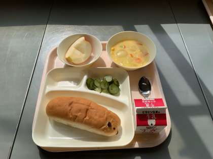 レーズンパン、牛乳、豆乳コーンクリームシチュー(米粉)きゅうりのバジル風味サラダ、りんごでした。