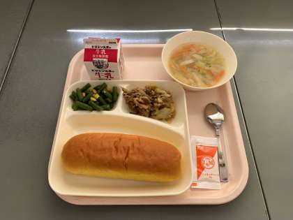 パンプキンパン、牛乳、豚肉のカレー風味焼き、鶏肉と野菜のスープ、さんどまめとコーンのサラダ(ノンエッグドレッシング)でした。