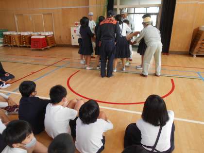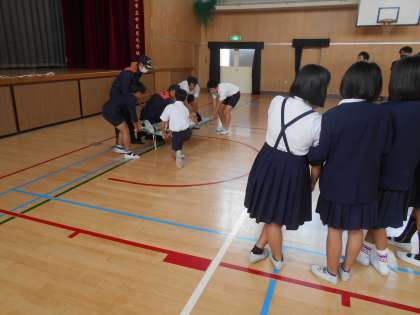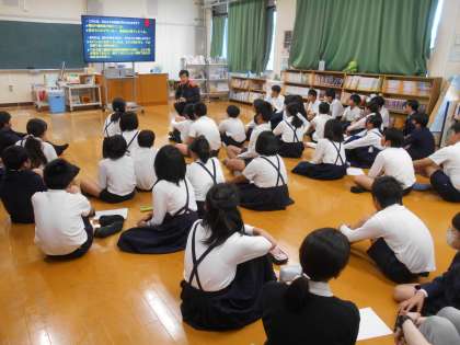 今日の2・3時間目に防災教室を行いました。高学年は講堂で毛布を使った搬送訓練を、図書室で防災クロスロードをしました。災害時には、どのようなことができるかを考えて行動できるように、消防署の方に教えてもらいました。災害が起こった時に忘れずに活かしてほしいです。