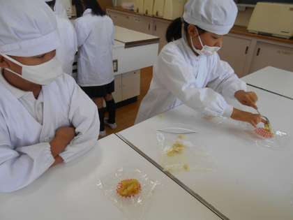先週収穫したサツマイモを食べました。熱を加えたサツマイモを袋に入れて、揉んで柔らかくした後、一人ずつラップにくるんで丸くして食べました。少しでしたがみんなおいしかったといっていました。みんなで植えて、育てて収穫できていい思い出になったと思います。(1組の様子です)